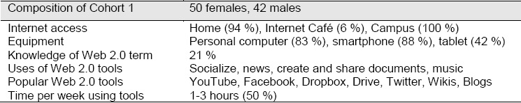 There was no difference between females and males in Cohort 1 regarding the use of Web 2. 0 tools and 90 % of the population considered the tools easy to use. Web 2.0 was believed to be useful for the learning process, but 93 % of the students disliked the idea of not having the traditional lecture, whereas 12 % mentioned that they were happy with only the traditional lectures. According to the results, students were aware of the advantages of Web 2.0, but they felt uncomfortable using only Web 2.0 tools for learning. This reluctance seemed not due to technophobic attitudes, because the students have adopted the new technologies in their everyday life; it seemed to be related to internal and external contexts, to beliefs and attitudes that the students have about teaching and learning practices. An induction or training for the use of Web 2.0 was unnecessary for this population, but this factor must be taken into account before the use of these tools together with the access to the Internet. Internet penetration varies by country or even within a country. According to Straumann and Graham (2015), there is an "archipelago of disconnection", in which the center of the cluster contains 28 countries with penetration less than 10 % of the threshold that they applied.