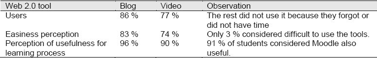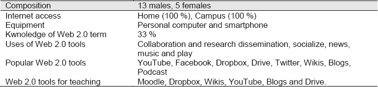 Most students in this study own a computer and smartphone and had access to Internet from home or an Internet cafe nearby. They also connected to Internet via Wi Fi or in the various computer rooms on campus. All used Web 2.0 tools for recreational purposes, to socialize, to follow the news and celebrities, to create and to share documents, to listen to music, so they were accustomed to YouTube, Facebook, Dropbox, Google Docs, Twitter, wikis and blogs, among other applications. The situation with the instructors was similar: they had access to Internet and used applications for their professional and personal lives.