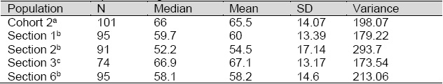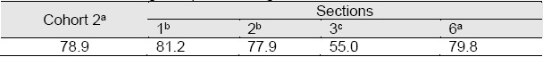 An independent Student's t test was used to validate statistically the differences observed in the medians and to compare performance. According to the statistical treatment, there was a significant difference between the academic performance of Cohort 2 students (M=66.0, SD=14.07) and those in sections 1 (M=59.7, SD=13.39), 2 (M= 52.2, SD=17.14) and 6 (M=58.1, SD=14.60) under the conditions t(186)=-3.294, p=0.002, t(174)=-5.758, p<0.001, t(182)=-3.6, p<0.001, respectively, but there was no difference in the academic performance between Cohort 2 (M=66.0, SD=14.07) and Section 3 (M=66.9, SD=13.17) under the conditions t(164)=0.476, p=0.635. The Student´s t test results confirmed that the performance of the students from Cohort 2 was better than all sections with the exception of Section 3. The difference between Section 3 and Sections 1, 2 and 6 was that the first one corresponds to the general organic chemistry course and the others to the accelerated organic chemistry course. The time invested in class for covering the key concepts in the general and the accelerated courses was the same, according to the syllabus of the courses and the information given by the different instructors. On the other hand, the cumulative grade-point averages for the sections were different, and Section 3 has the lowest cumulative grade point average (Table 6). The applied exams and the topics evaluated were also different for the accelerated and the general organic chemistry course: the first one covers more topics in the examination. A better performance of students in the general organic course might be favored with this situation. Students from accelerated courses might feel time constraints in completion of the topics to be covered for the examination: this distress was not necessarily present in the general course.