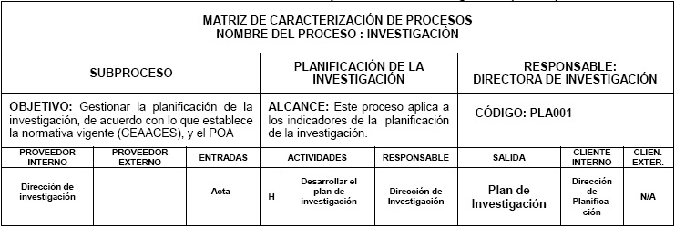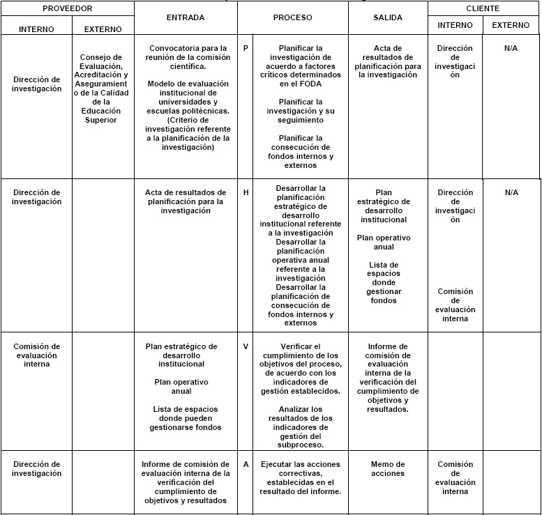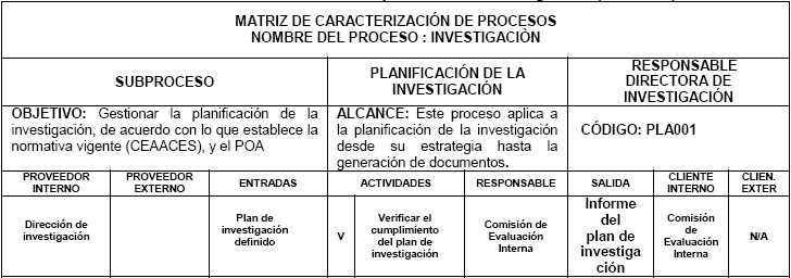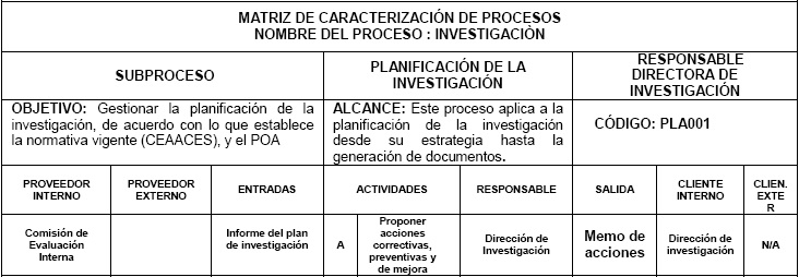 Como se puede ver en la Tabla 7, la entrada es el plan de investigación, mientras que la salida es un informe que emite la comisión de evaluación interna, a fin de que este sea útil para la siguiente etapa. En el momento de realizar el informe, la comisión debe tomar en cuenta que lo planificado sea ejecutado de acuerdo con lo establecido en el cronograma de actividades para dar cumplimiento a lo que establece el CEAACES y superar los factores críticos.