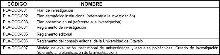 El subproceso de planificación de la investigación le aportó al SGC tres documentos propios y siete en total (Tabla 11), requeridos por la institución y por el CEAACES, a cada uno de los cuales le fue asignado un código alfanumérico que consta de nueve caracteres para su identificación. Los documentos propios son los tres primeros y el resto son de consulta para el subproceso.