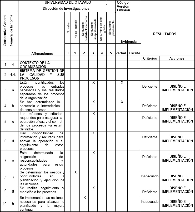 Finalmente, para completar el diagnóstico se aplicó un instrumento al que se denominó Herramienta Diagnóstico, con el objetivo de identificar los factores internos y externos que han afectado el proceso investigativo para determinar los factores críticos de éxito. Su aplicación se realizó con base en los fundamentos de la Norma Internacional ISO 9001: 2015. Fueron evaluadas 177 afirmaciones considerando su estado actual en cuanto a: no sabe, no se cumple, se cumple insatisfactoriamente, se cumple aceptablemente, se cumple en alto grado, se cumple plenamente. Se constató si la evidencia era verbal o escrita y con base en ello fue calificado cada ítem según los criterios de: deficiente, inadecuado y satisfactorio. Según la calificación y la puntuación obtenida, se tipificó el tipo de acción en tres opciones a ejecutar para la mejora de la calidad: diseño e implementación, mejoramiento o mantenimiento. Los aspectos evaluados fueron: