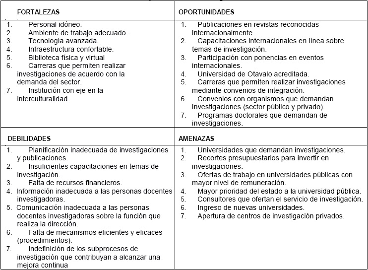 El análisis FODA se utilizó con el objetivo de determinar la situación actual del proceso de investigación, se analizaron sus características internas y externas, mediante matrices EFI para la evaluación de los factores internos (fortalezas y debilidades) y EFE para la evaluación de los factores externos (oportunidades y amenazas).El objetivo final de la construcción de la matriz es determinar las ventajas competitivas y la estrategia genérica a seguir en el proceso de investigación (Wheelen y Hunger, 2011).