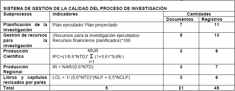 Asimismo, el diseño del SGC para el proceso de investigación quedó conformado por cinco subprocesos, con sus respectivas matrices de caracterización, flujogramas y procedimientos. Asociado a cada subproceso, un indicador de carácter cualitativo para el subproceso planificación de las investigaciones y cuatro de tipo cuantitativo para los restantes subprocesos. El procedimiento quedó detallado en 21 documentos y cuarenta y cinco registros, los cuales son instrumentos útiles para incrementar la eficacia de la gestión y la mejora continua del proceso investigativo.