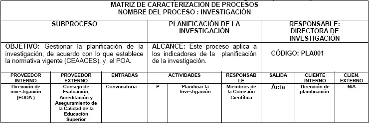 A continuación y a modo de ejemplo, se realiza la caracterización del subproceso Planificación de la investigación, según el ciclo PHVA.