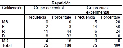 b. Grupo cuasi experimental. En este grupo, el porcentaje de repeticiones se presenta como sigue: MB: 20%, B: 56%, R: 24%, D: 0%, MD: 0%.