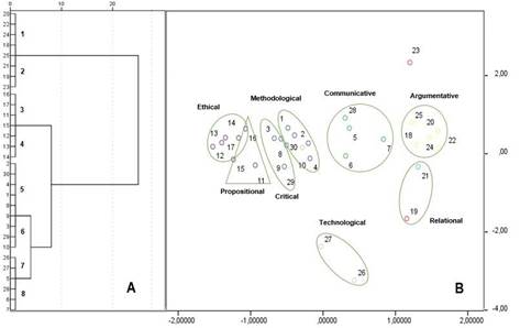 The matrix, that is now graphically represented in the dendrogram (see Figure 1 part A), allowed to identify the proximity between the learning outcomes and 8 groups, whose classifications confirmed and explained the competences in formative research. Subsequently, a dispersion chart was built (see Figure 1 part B); this chart allowed identifying and explaining the classification of learning outcomes in initial categories. The scatter plot only includes the 30 most significant weight and density learning outcomes, based on the analysis of voices and theoretical sampling (qualitative analysis).