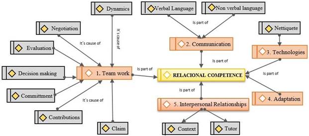 In the field of educational research, cooperative and collaborative work has been fostered based on the roles played during planning, execution and research production. During TER, situations arise in which social and emotional relationships are considered as opportunities for research consolidation, academic productivity and job satisfaction. Liaising between pairs brings about better productive results than an individual research work (Torrelles et al., 2011). Based on these premises, crosscutting relational competence is considered, due to its prominence in all phases of the research process. Vygotsky states that most of the things that an individual learns and internalizes are associated with relationships and interactions with others in a particular context.