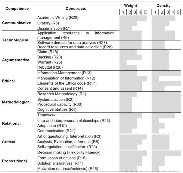 Based on the identification and classification of the learning results (quantitative data) and the data analysis results through the triangulation process (qualitative data), a conceptual taxonomic approach of competencies in educational research training is presented. The triangulation based on the voices of the context compared with the theory and the position of the researcher, allowed to identify competencies and constructs as part of the fundamental criteria for evaluation of TER. Based on the values of density (number of associations) and weight (number of quotes identified in the collected data) associated to each category (Table 2), 9 competences were identified for training in educational research related to: communication, analysis, argumentation, research ethics, use of technologies, relational capacity, critical thinking, the method and the proposition.
