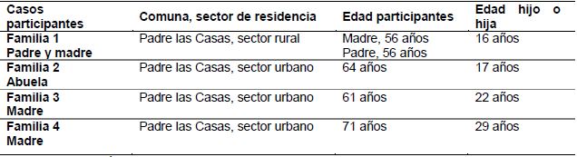 Para la selección de participantes se utilizó un muestreo de tipo intencional. Este tipo de muestreo se rige por el juicio experto de personas investigadoras. Es decir, se trata de cautelar que las personas cuenten con conocimientos y experiencias suficientes para profundizar en las temáticas de la investigación. De tal modo, el muestreo intencional “…permite seleccionar casos característicos de una población limitando la muestra sólo a estos casos. Se utiliza en escenarios en las que la población es muy variable y consiguientemente la muestra es muy pequeña” (Otzen y Manterola, 2017, p. 230). En una primera instancia, la totalidad de participantes de la agrupación acceden de manera voluntaria a relatar por escrito sus vivencias mediante la elaboración de semblanzas. En una segunda instancia, se revisaron las semblanzas para determinar la riqueza de los relatos expresados. Esto permitió seleccionar a cinco participantes, quienes además accedieron a participar de una entrevista en profundidad. En consecuencia, las personas que configuraron los casos fueron un padre, tres madres y una abuela cuyas edades fluctúan entre 56 y 71 años, pertenecientes de la Agrupación PLC Down de la comuna de Padre las Casas, región de la Araucanía, Chile (Tabla 2). Respecto a los criterios de inclusión, se consideró a familias con hijos e hijas con SD desde 15 años de edad en adelante.