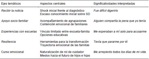 Las familias suponen que el cuidado de sus hijos e hijas con SD será asumido por sus hermanos o hermanas, quienes se harán cargo cuando los padres y madres no estén. Si bien son conscientes que no tienen absoluta responsabilidad en el cuidado del hijo o hija con SD, entienden que los hermanos o hermanas deberán asumir el rol de cuidado.: “…sé que tiene a sus hermanos y ellos lo van a cuidar, les tengo metido en la cabeza, pero igual entiendo de que no tengo por qué pasarles la responsabilidad a mis hijos e hijas, porque no es su responsabilidad” (E4). En efecto, las emociones son una constante en la vida de las familias, y se dan en una trayectoria durante el ciclo vital. Los sentimientos deben ser considerados como parte importante de la vida de todos los miembros del núcleo familiar, en la medida en que estos se encuentren en equilibrio, permitirán una mejor armonía en el hogar. A continuación, la Tabla 3 presenta una sistematización de los aspectos más relevantes de cada uno de los ejes temáticos.