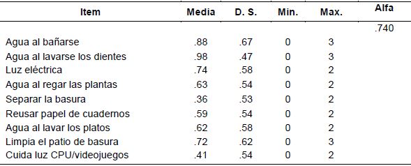 Así mismo, se observó que el estudiantado reporta una ligera presencia de habilidades para el cuidado del medio ambiente, sobre todo aquellas dirigidas al cuidado del agua al lavarse los dientes y al bañarse, lo anterior permite sugerir la existencia de disposiciones psicológicos que generalmente se presentan en los niños y niñas sobre el cuidado del agua, corroborando lo observado en estudios anteriores, donde los niños y niñas son los que presentan principalmente disposición y conductas al cuidado del medio ambiente (Fraijo, Corral, Tapia y García, 2012; Palacios y Bustos; 2012; Sánchez, 2014). Sin embargo, en lo que respecta a las habilidades del cuidado de los residuos, se observaron medias bajas para acciones como la separación de la basura y el reúso de los cuadernos.