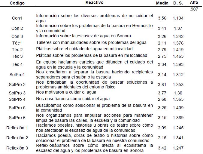 El instrumento aplicado a estudiantes constó de reactivos distribuidos de la siguiente manera: “Práctica de educación ambiental” que refieren a conocimientos de problemas ambientales (3 reactivos), por ejemplo, “nos brindaban información sobre los problemas que hay con la basura en Hermosillo y en nuestra comunidad…” y “nos brindaban la oportunidad de buscar soluciones a problemas ambientales del entorno físico”, técnicas (4 reactivos) ejemplo “en mi escuela…nos daban pláticas sobre los problemas de la basura en mi localidad”, solución de problemas (6 reactivos) un ejemplo es: “En mi escuela…nos ayudaban a organizarnos para impulsar acciones para mantener limpia de basura las calles, la escuela y la comunidad”, y reflexión en clase sobre la problemática ambiental (3 reactivos) un ejemplo del reactivo es: “... reflexionábamos sobre cómo afecta al ecosistema la escasez del agua y los problemas de basura en Sonora y en nuestra comunidad”.