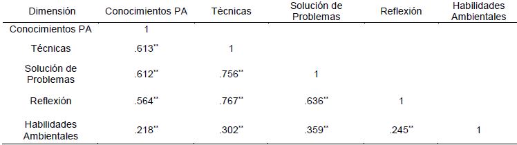 Una vez construidas las variables para la escala de educación ambiental, se procedió a someter las variables de conocimientos proambientales del maestro, técnicas didácticas, solución de problemas y reflexión, a una matriz de correlaciones junto a las habilidades ambientales reportadas por el estudiantado.