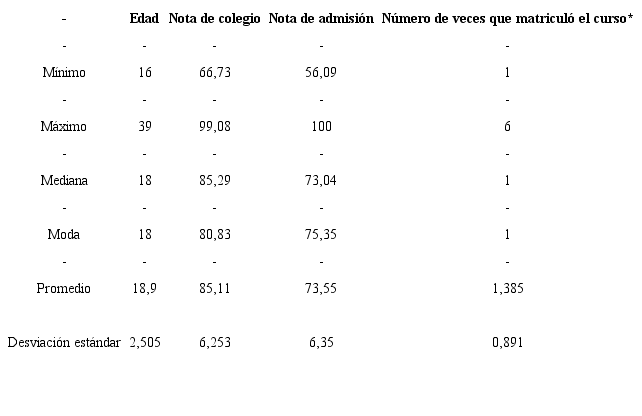 De acuerdo con los datos de la Tabla 1, la mayor parte del estudiantado que matricula el curso de Matemática General cuenta con condiciones idóneas para tener un buen desempeño académico dado que no laboran, viven en la GAM y no poseen descendencia. Además, sus notas promedio en el examen de admisión y notas de colegio evidencian un rendimiento previo en la educación secundaria aceptable, según la nota mínima de calificación en el Ministerio de Educación Pública (MEP), y un buen rendimiento en la prueba de aptitud académica (ver Tabla 2).