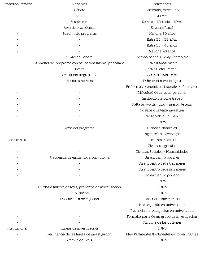 La técnica de recolección de información fue la encuesta y se utilizó como instrumento de recolección de datos un cuestionario estructurado conformado por 15 indicadores (tabla 1) destinados a la evaluación de los factores asociados a las dimensiones personales, académicas e institucionales, de los cuales 5 ítems fueron de caracterización socio-demográficas (género, edad, procedencia, edad de inicio, estado civil). La forma de administración del cuestionario fue vía electrónica mediante la plataforma Google Drive. La encuesta se realizó entre noviembre de 2016 y julio de 2017.Para el componente cualitativo, se utilizó la entrevista semiestructurada a dos tutor o tutora; dos personas graduadas (con tesis) y 2 personas egresadas (sin tesis).