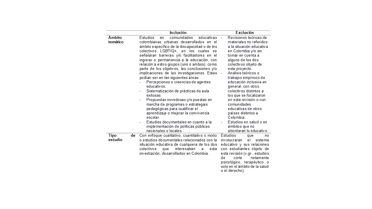 En línea con lo antes expuesto, se realizó una revisión sistemática documental en la que se analizaron estudios empíricos y documentales de diversa índole. Dichos estudios incluyeron experiencias educativas tendientes a la plena inclusión en aulas de educación urbana en Colombia de PcD y comunidades LGTBIQ+, así como investigaciones con agentes de diferentes niveles educativos (v.gr., educación inicial, básica, media, técnica-tecnológica o superior) encaminadas a recoger percepciones, creencias, imaginarios, o buenas prácticas de enseñanza y aprendizaje con ambos grupos de estudiantes. De igual modo, se consideraron innovaciones educativas propuestas y/o probadas en aulas regulares del sistema educativo colombiano, cuya finalidad estuviera centrada en mejorar el acceso o la permanencia de PcD o del alumnado LGBTIQ+ y los legados que quedaban de su puesta en marcha o que podrían derivarse de su potencial implementación. Cabe señalar que todos los trabajos debían aparecer citados en bases de datos de revistas indexadas o circular en Google Académico y podían corresponderse con artículos de investigación, de revisión o de reflexión, o ser trabajos de grado aprobados de pregrado, posgrado o tesis doctorales.