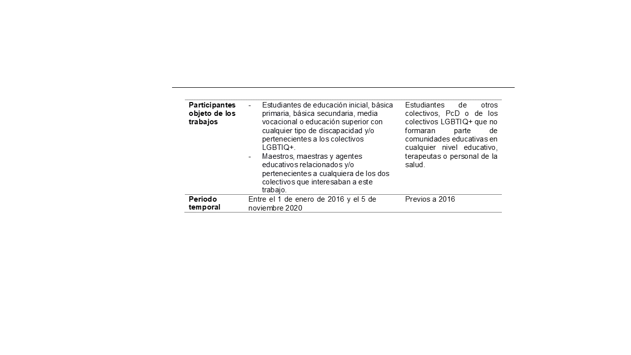 Cabe señalar que la primera indagación se realizó introduciendo los términos “experiencias educativas”, “discapacidad”, “orientaciones sexuales diversas”, “identidades de género diversas”, “grupos LGBTIQ+”, “Colombia”, empleando siempre los operadores booleanos AND, OR y NOT, de cara a obtener la mayor cantidad de registros posibles. Luego de eliminar publicaciones duplicadas, libros y revisiones teóricas generales en educación inclusiva se obtuvieron, en total, 285 publicaciones para estudios con colectivos LGBTIQ+ y 695 trabajos con discapacidad. Una vez filtrados aquellos registros anteriores a 2016, quedaron 35 trabajos con comunidades LGBTIQ+ y 143 con discapacidad. Dado que en estas primeras búsquedas se observó una escasa representatividad de investigaciones con estudiantes con Trastorno del Espectro Autista (en adelante, TEA), se realizó una nueva indagación intentando rastrear trabajos que contemplaran a este colectivo. Así las cosas, los términos empleados para esta consulta fueron “experiencias educativas”, “Trastorno del Espectro Autista” y “Colombia”, usando los operadores booleanos mencionados previamente. Como resultado obtuvimos 27 trabajos centrados en autismo.