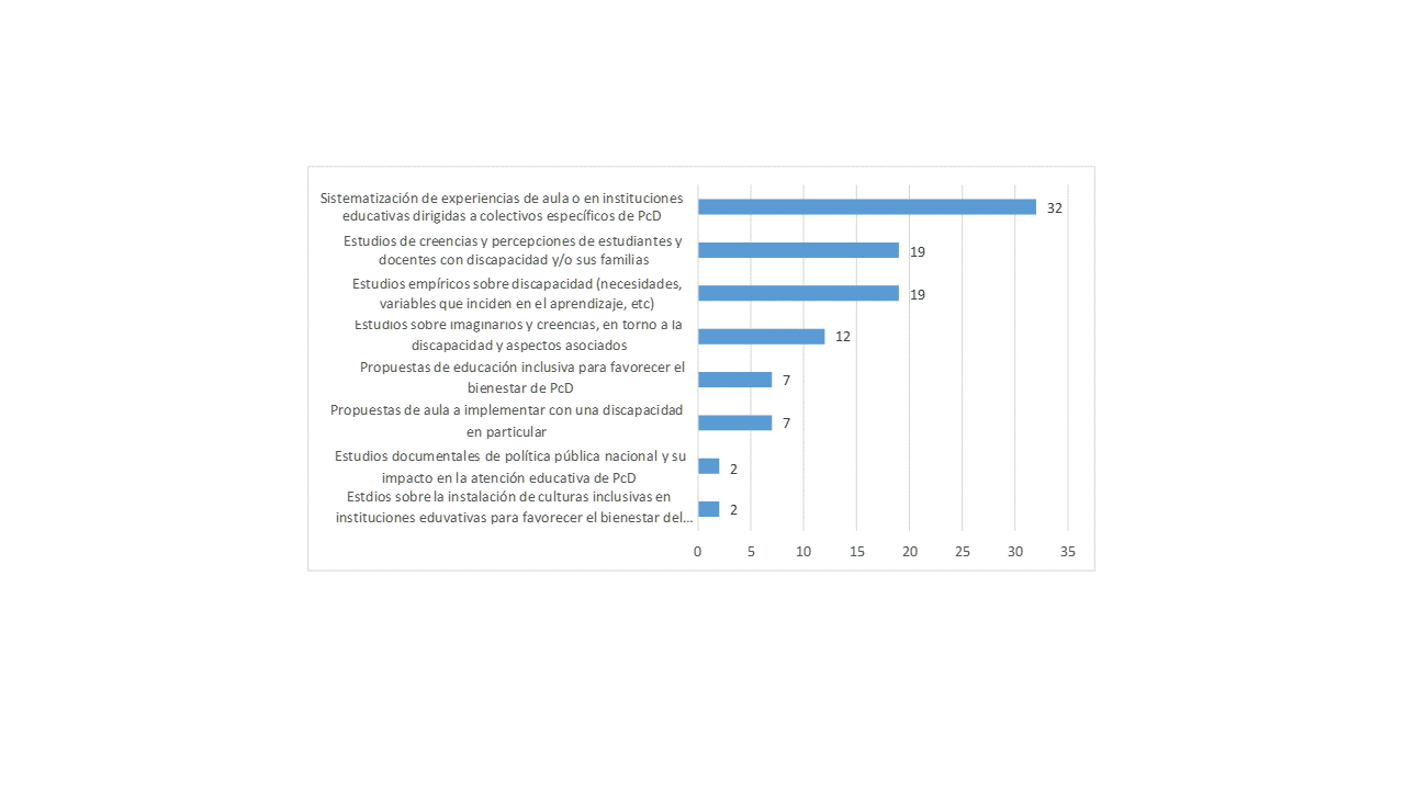 En términos globales, la mayoría de trabajos consultados se corresponde con procesos de sistematización de experiencias de aula llevados a cabo en instituciones de educación básica primaria de carácter público, ubicadas en ciudades capitales (v.gr., Bogotá, Bucaramanga, Medellín y Cali). Un número importante de los estudios consideró como participantes el profesorado (22 de 43), así como estudiantes con discapacidades sensoriales (visual y/o auditiva) y/o discapacidad intelectual (30 de 43).