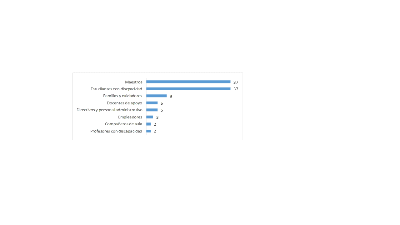 Es importante señalar que, en Colombia, no se ubicaron trabajos específicos que documenten barreras y/o facilitadores para estos colectivos, en los distintos niveles de la educación básica y superior. Si bien se han sistematizado las percepciones y representaciones sociales del profesorado sobre la discapacidad y se han documentado estudios de caso que relatan experiencias de instituciones educativas concretas o de alumnos y alumnas particulares, no se tiene aún una mirada de conjunto.