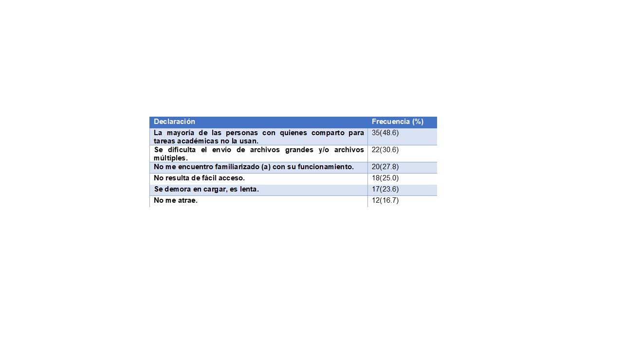 Con relación a las causas que motivaron ubicar una plataforma en último lugar de preferencia, el 35 % aseguró que las personas con las que comparte no emplean la plataforma, mientras que la dificultad para enviar archivos grandes o múltiples constituyen un motivo para que el 30.6 % desplace hacia el final una plataforma online.