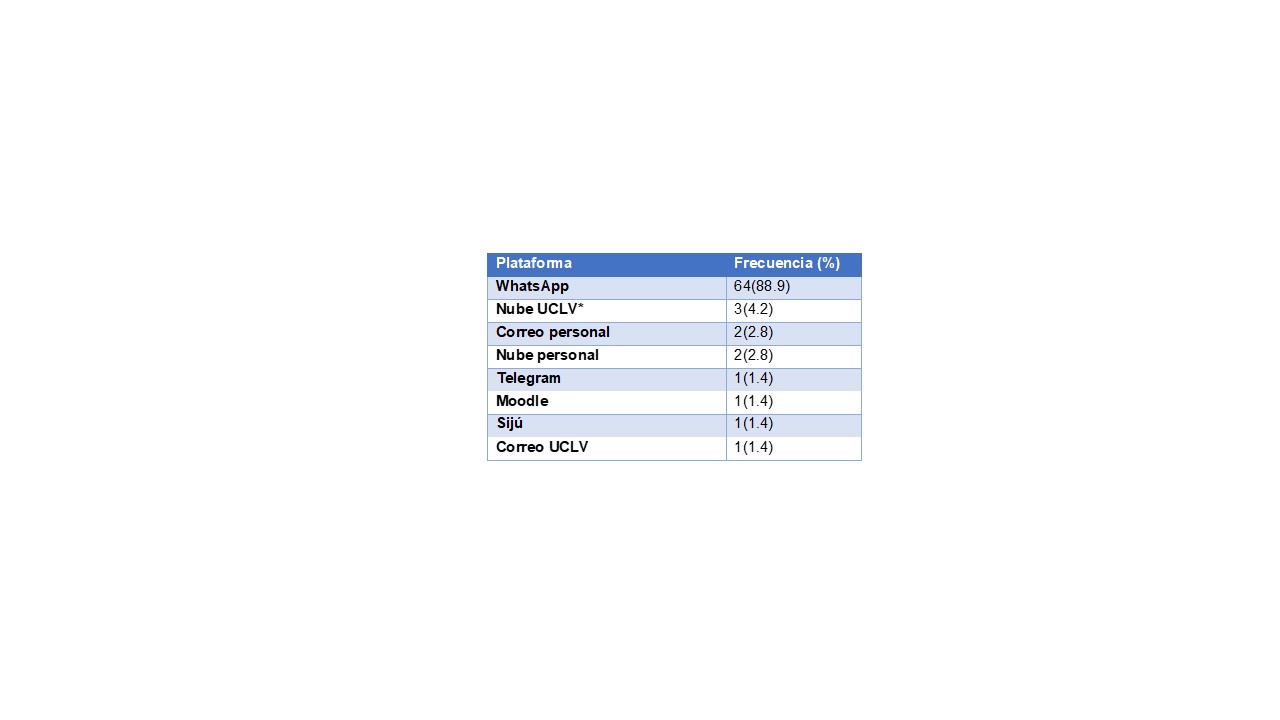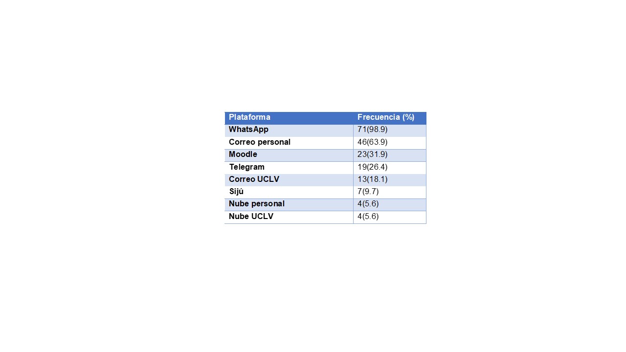 En cuanto a las preferencias para el empleo de una u otra plataforma, el 88.9 % emplea WhatsApp como plataforma principal para el aprendizaje en línea. El resto de las plataformas constituye la opción principal para una frecuencia mínima de estudiantes, que oscila entre 1.4 % y 2.8 %, en función de la plataforma puntual (Tabla 3).