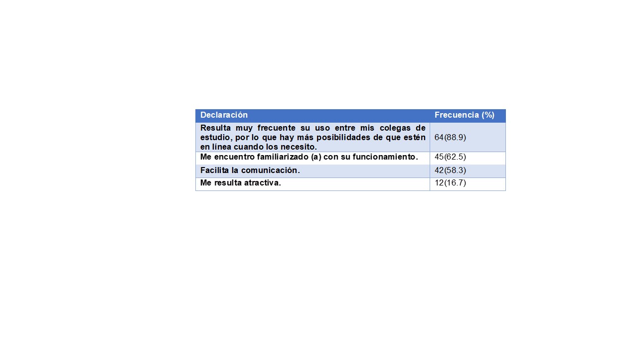 Dentro de las causas que motivan ubicar una plataforma en primer lugar, el 88.9 % expresó que resulta frecuente su uso entre colegas de estudio. El 62.5 % se encuentra familiarizado con su funcionamiento, y el 58.3 % coincidió en que facilita la comunicación.