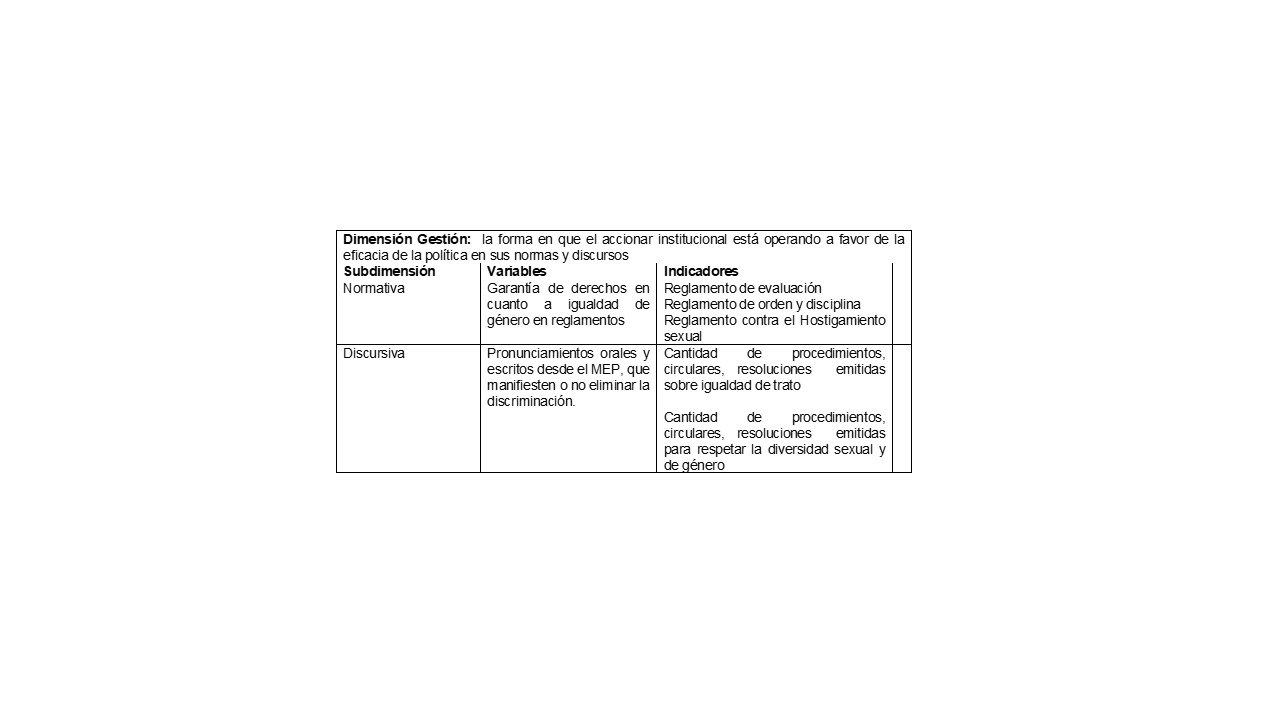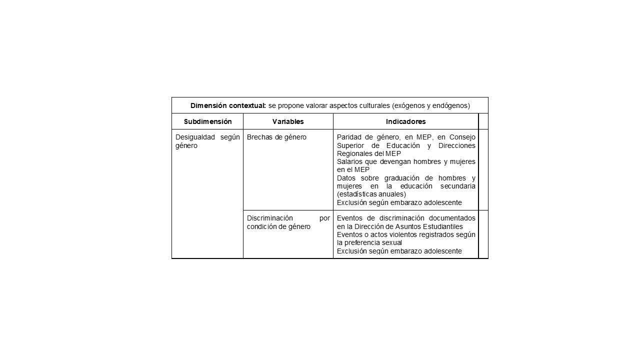 Entre otras preguntas que guían la evaluación de esta dimensión contextual están las siguientes: ¿Cuáles son las características culturales que reproducen brechas y discriminaciones según género? ¿Cuánto se ha logrado en la paridad en órganos directivos? ¿Existe exclusión por condición de embarazo o de maternidad? ¿Cuáles son las condiciones culturales de la institucionalidad pública en que se inscribe el esfuerzo del MEP por la igualdad y la equidad de género? ¿Cómo se enfrenta el embarazo adolescente en el sistema educativo en general y en los centros educativos en particular? ¿Tienen trato igualitario las estudiantes madres y los estudiantes padres? En los procesos para prevención del embarazo a temprana edad, ¿están considerando la igualdad y la equidad de género? Esta relación entre dimensión variables e indicadores se puede apreciar en la tabla 1 se aprecian las dimensiones, variables e indicadores.