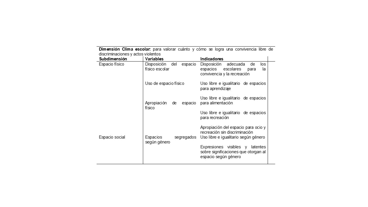 La segunda dimensión, que se denomina clima escolar, refiere a la relación con el espacio educativo, el uso y apropiación del espacio físico y los significados atribuidos para indagar la manera en que estas variables dan indicaciones de la igualdad o desigualdad de género.