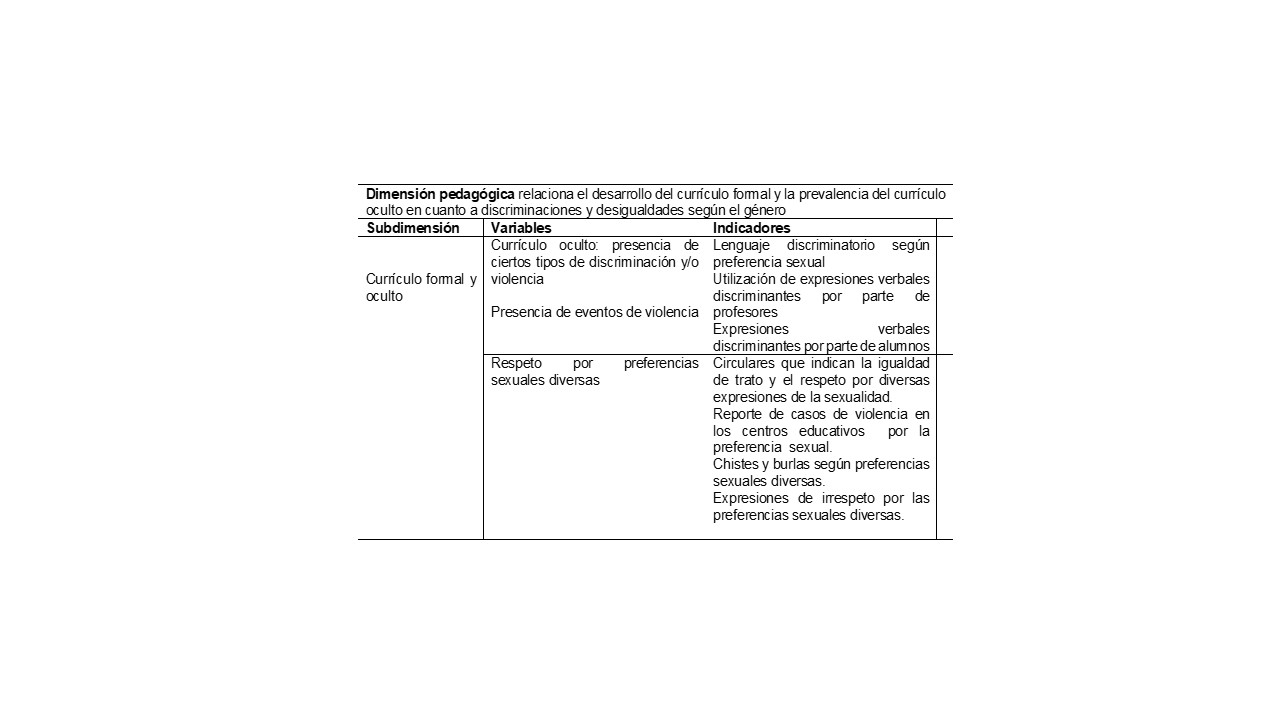 Otra dimensión que parece apropiada se refiere al ámbito pedagógico relaciona el desarrollo del currículo formal y la prevalencia del currículo oculto en cuanto a discriminaciones y desigualdades según el género. Se suma a la consulta sobre la forma en que se atiende lo relativo a la diversidad sexual y sus repercusiones en el ámbito pedagógico. Dentro de esta, se plantean preguntas orientadas a si, en la relación pedagógica, ¿se presentan eventos discriminatorios? La diversidad de preferencias y vivencias de la sexualidad, ¿se tratan con respeto y en igualdad de condiciones? ¿Se presentan eventos o casos de violencia en los centros educativos que se sustenten por las preferencias sexuales? ¿Se presentan chistes o burlas según las preferencias sexuales? En la tabla 3 se presentan las variables e indicadores que se estimarían en este ámbito pedagógico.