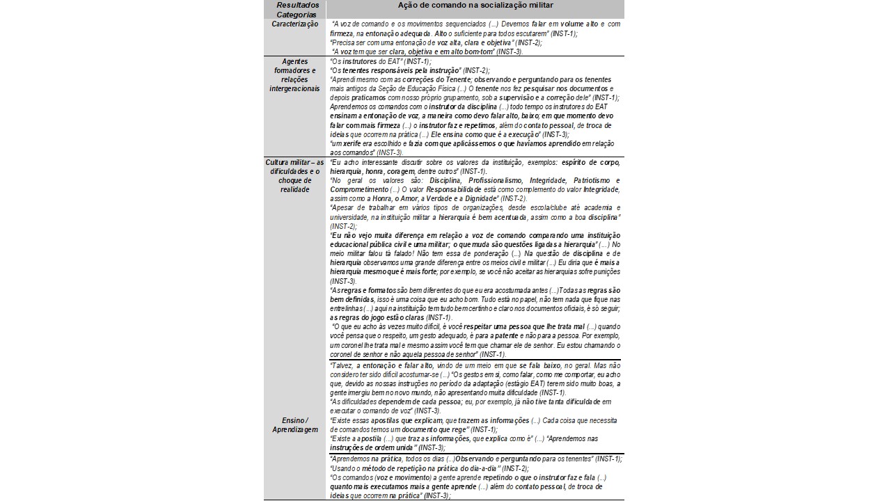 Eixos temáticos: caracterização; agentes formadores e relações intergeracionais; cultura militar – as dificuldades e o choque de realidade; ensino-aprendizagem; outras fontes de apoio; uso da ação de comando no ensino (tabela 5).