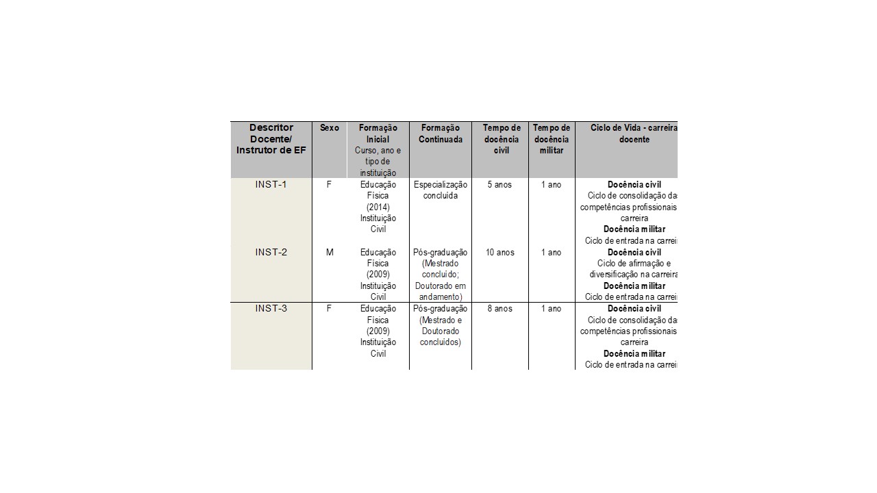 Cabe esclarecer que os docentes de Educação Física, em instituição civil, são chamados professores; porém, ao serem admitidos em instituição militar, eles passam a ser denominados instrutores. Os participantes são identificados pelas siglas INST-1, INST-2 e INST-3. A tabela 1 apresenta a caracterização dos participantes.