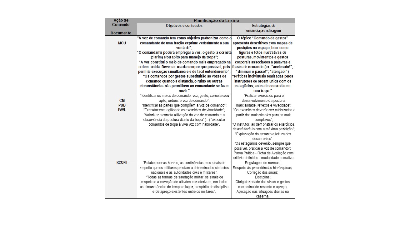A escolha dos documentos se deu mediante um processo de seleção, que teve como ponto de partida a consulta às “Normas Reguladoras para os Cursos e Estágios do Centro de Instrução e Adaptação da Aeronáutica” (Brasil, 2018); dado que esse documento indica que os principais documentos dos processos formativos daquela instituição educacional militar são: 1) o Currículo Mínimo (CM) - é um documento que determina o conteúdo programático mínimo a ser desenvolvido para determinado curso ou estágio; 2) o Plano de Unidade Didática (PUD) - é um documento que desdobra, detalhadamente, as ementas, os objetivos, os conteúdos, as recomendações metodológicas e as referências bibliográficas de cada unidade didática ou disciplina que o integra, sendo que, no caso do EAT, o PUD é composto por 14 disciplinas (Brasil, 2015-b); e 3) o Plano de Avaliação (PAVL) – é um documento que contém o detalhamento da sistemática de avaliação do ensino para os cursos e estágios ministrados (Brasil, 2018). Deste modo, foram selecionados os seguintes documentos do EAT: Currículo Mínimo / CM (Brasil, 2015-a); Plano de Unidades Didáticas / PUD (Brasil, 2015-b); e o Plano de Avaliação / PAVL (Brasil, 2015-c). Estes documentos foram lidos buscando, neles, observar como emerge a ação de comando. A leitura destes documentos permitiu, ainda, perceber que a ação de comando se faz presente especialmente em duas disciplinas do EAT: a “Ordem Unida” e a “Legislação Militar I”. Foram realizadas, também, leituras das referências bibliográficas destas duas disciplinas buscando perceber aquelas nas quais emerge a ação de comando. Assim, foram selecionados mais dois documentos que constavam nas referências bibliográficas destas duas disciplinas, quais sejam: o Manual de Ordem Unida/MOU (Brasil, 2019) e o Regulamento Interno de Continência, Honras e Sinais de Respeito e Cerimonial Militar das Forças Armadas / RCONT (Brasil, 2009).