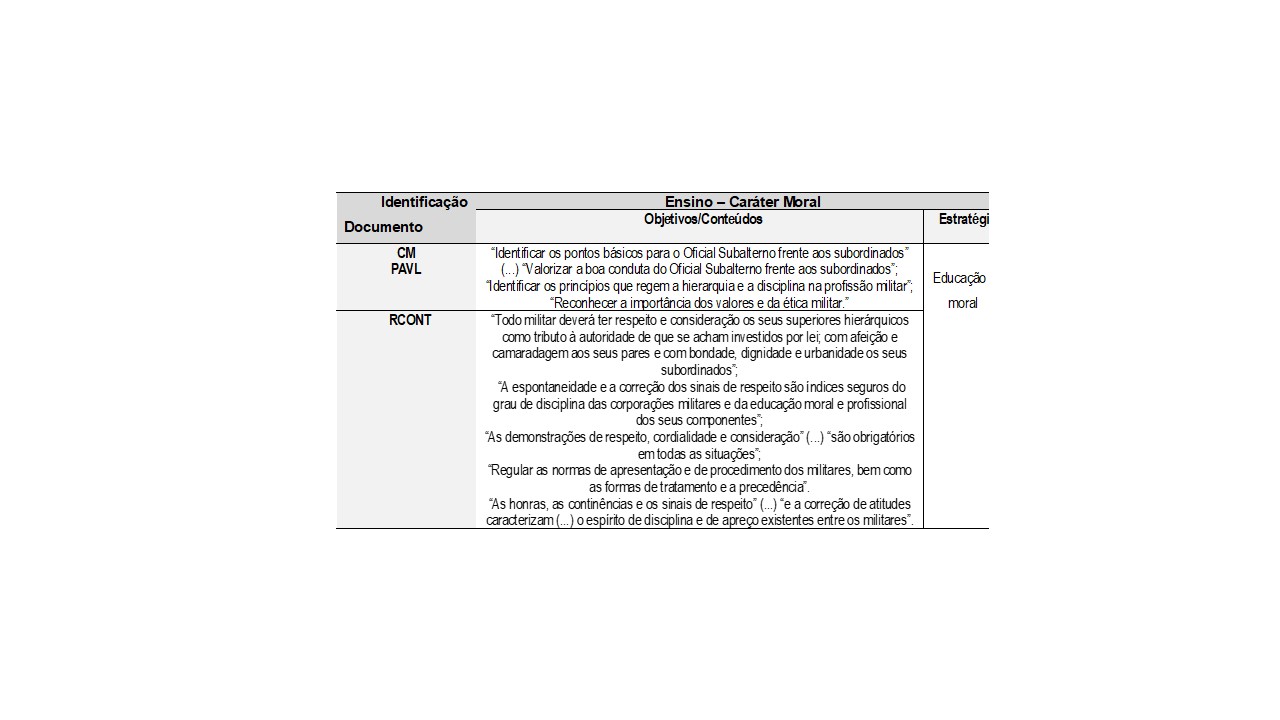 Já a tabela 3, a seguir, apresenta resultados da análise de conteúdo dos documentos militares, identificados na temática de uma pedagogia de caráter moral.