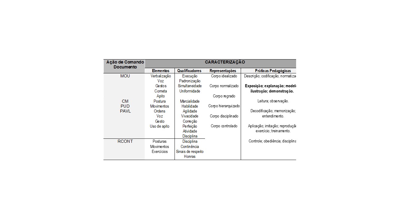 Quando observados, na tabela 4, os qualificadores da ação de comando (os termos são apresentados tal como identificados na análise de conteúdo e assim são mantidos, a despeito das tautologias) e às representações de corpo às quais servem tais ações, nota-se que as ações de comando atuam no engendramento e na manutenção das lógicas de controle no contexto militar. Desta forma, a ação de comando, ao se prestar aos sinais de respeito, às continências e às honras, atua na afirmação da hierarquia; ao servir para padronização, uniformidade e simultaneidade na execução de movimentos e ações, atua na normalização, na disciplina, na correção e no controle do corpo; ao compor a atividade, a marcialidade, a habilidade, a agilidade, a vivacidade, a correção e a perfeição, atua na construção do corpo regrado e idealizado.