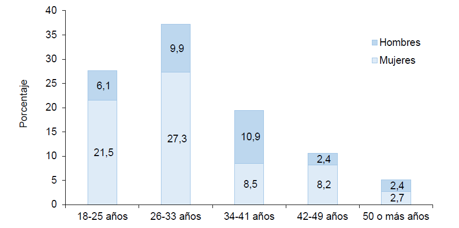 Entre las personas que contestaron un 68 % son mujeres y el restante 32 % hombres, además, la mayoría son jóvenes o adultos jóvenes en su etapa inicial de madurez[3] que tienen 33 años o menos (64.6 %) (Figura 1).