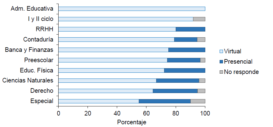 Al contrastar estas dos variables categóricas (modalidad de preferencia y carrera) se observa una relación estadísticamente significativa al 5 % (χ^2 (9,n=284)=18.39,p=0.0310). Este resultado se debe a que en las carreras de Administración Educativa y Educación de I y II ciclo hay prácticamente un 100 % de preferencia por las clases virtuales, las proporciones en las demás carreras son muy similares, alcanzando un máximo de 35 % de preferencia por la presencialidad en la carrera de Educación Especial.