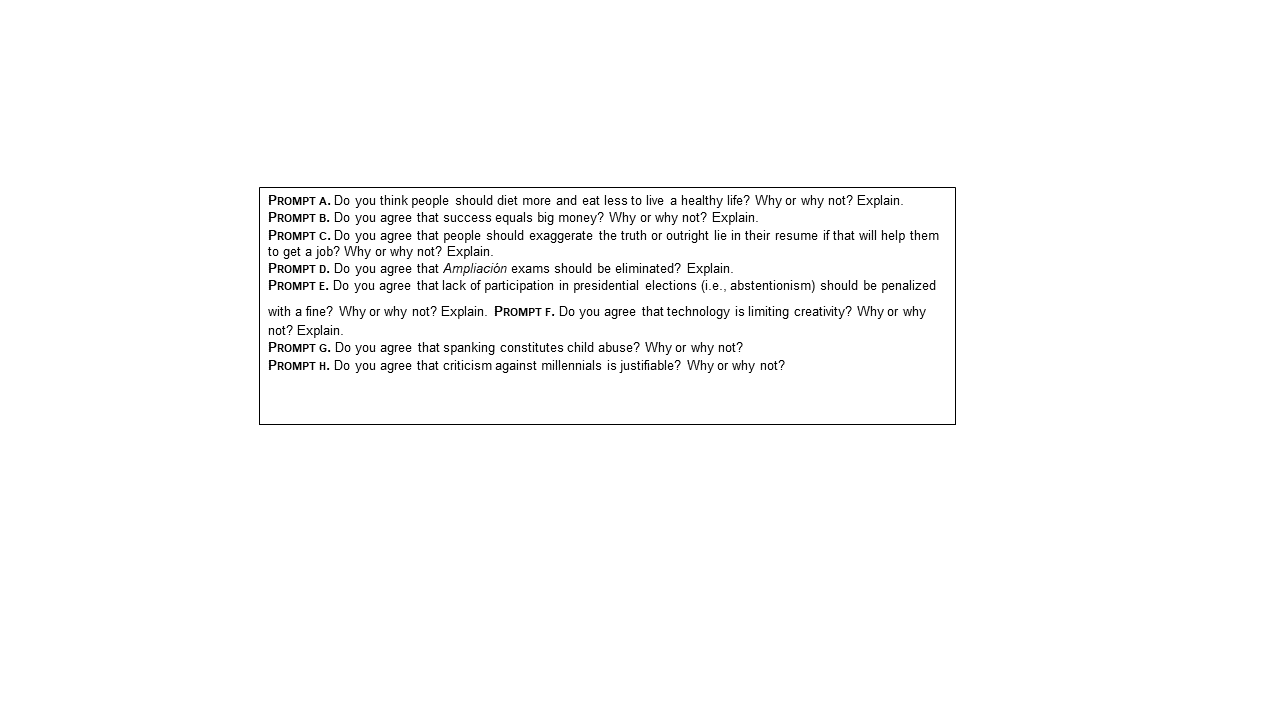 A week later (Week 2), learners had the chance to choose one writing prompt and develop the answers in the sheets provided. They had 30 minutes to complete the task. Because no language lab was available at the time of writing, all argumentative compositions were pen-and-paper texts. However, if one was available during the schedule of test taking, learners were able to take the online version of the proficiency test.