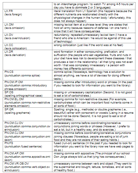 Nevertheless, criticism to EA and CA theories because they were too limited in their focus (Bitchener, 2016; Ellis, 1994), on the one hand, and the incorporation of computers in data collection, on the other hand, shifted empirical efforts to a line of inquiry with a methodology that studies language use beyond the causes of L2 errors and L1 comparisons to understand them: that is, corpus linguistics. Lindquist (2009) defines corpus as “a collection of texts which is stored on some kind of digital medium and used by linguists to retrieve linguistic items for research or by lexicographers for dictionary-making” (p. 3). As a result, there are large native corpora that contain all sort of samples of English, which is the most studied language thus far (Granger, 1998a). Some of these are the Brown/Frown Corpus, the London-Lund Corpus of Spoken English (LLC), the Bank of English (BoE), the British National Corpus (BNC), the Corpus of Contemporary American English (COCA), and the International Corpus of English (ICE). Interestingly, the emergence of native English corpora made it clear that there was also a need for corpora that studied English as used by L2 learners, hence the term learner corpora (Díaz-Negrillo, 2009; Nesselhauf, 2004). Among the most prominent learner corpora are the International Corpus of Learner English (ICLE), the Longman Learners’ Corpus (LLC), and the Hong Kong University of Science and Technology (HKUST) learner Corpus (for a comprehensive list, see Lindquist, 2009; Pravec, 2002). Currently, learner corpora “give us access not only to errors but also to learners’ total interlanguage” (Granger, 1998b, p. 6)[2]. One lack, however, is that much of the understanding of English errors at a university level comes from seminal work on native-speaker corpora (Connors and Lunsford, 1988; Hodges, 1941; Johnson, 1917; Lunsford and Lunsford, 2008; Witty and Green, 1930), and when studies with EFL university learners have been conducted, the context is situated mainly in Europe (e.g., Dagneaux et al., 1998) and Asia to a lesser extent (Narita, 2013).