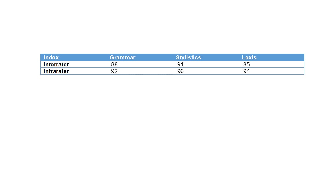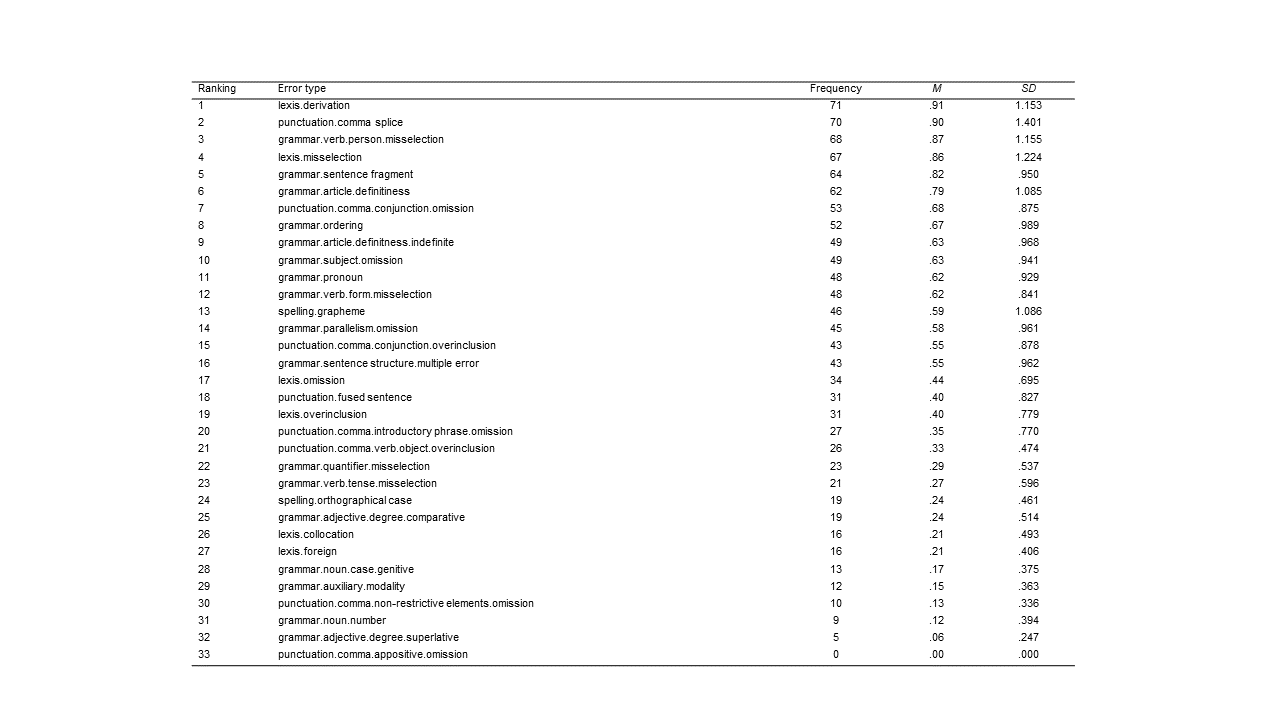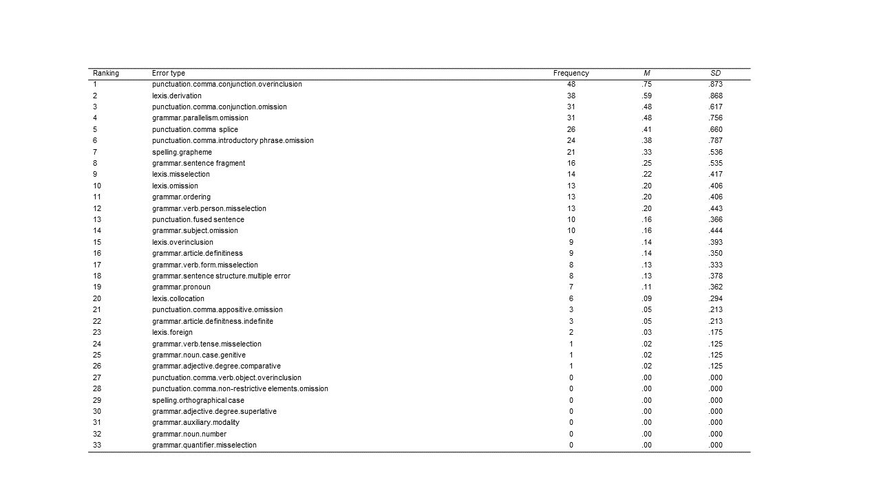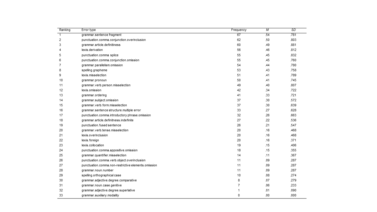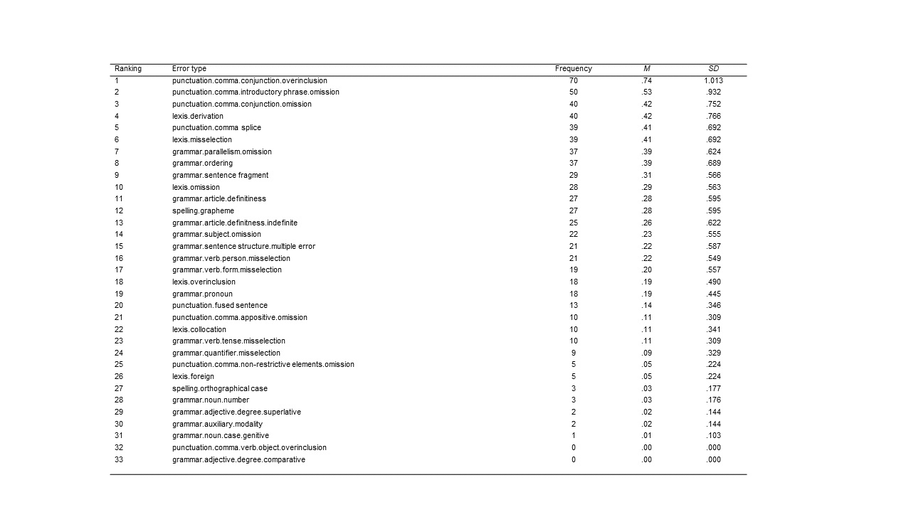 Specifically, as in previous reports on college writing errors (Lunsford and Lunsford, 2008), all errors present in the text were marked, meaning that error types “emerge[d] out of the data rather than being imposed on them prior to data collection and analysis” (Patton, 1990, p. 306). Thus, after having traced all existing error types and confirmed acceptable interrater and intrarater reliability (see Cronbach’s alpha values in Table 1)[3], thirty-three error types were identified—all of which belonged to either of the grammatical (n = 17) and non-grammatical error categories (n = 16). The latter was then further subdivided as (i.e., stylistics) (n = 10) and lexical (n = 6) for a more fine-grained analysis. All throughout the reference manual was A Comprehensive Grammar of the English Language (Quirk et al., 1985).