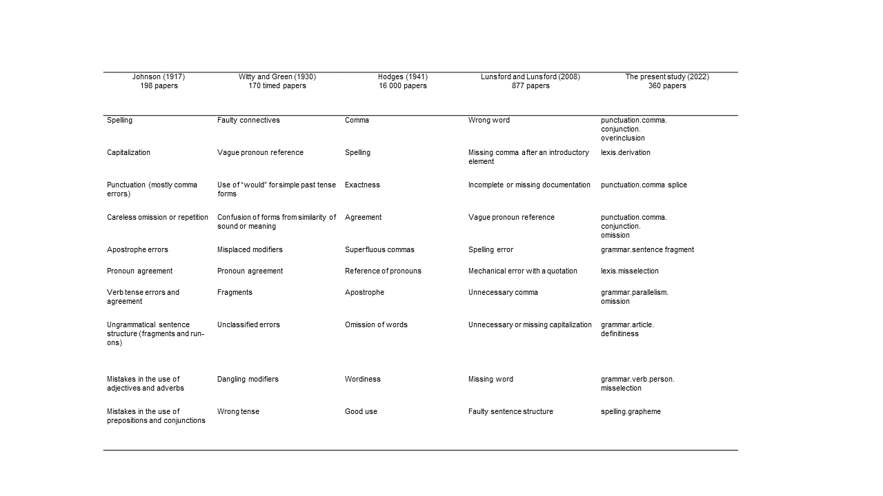Just as previous corpus-oriented work on college writing errors (Connors and Lunsford, 1988; Lunsford and Lunsford, 2008), this study sheds more light on error patterns of university writers. Nonetheless, by (1) including learners’ academic year as a variable, (2) having a sample that consists of Spanish L1 English (Teaching) majors only, and (3) employing a computer-tagging system, the present exploratory study renders a fine-grained analysis not available thus far. More specifically, if the L2 error patterns of this study were to be displayed as a whole, the ranked categories—as previously shown from Table 2 to Table 5—would paint a completely different picture. While not exhaustive, Table 6 summarizes a historical top ten error list. This list seeks to compare English errors as found in native corpora (Connors and Lunsford, 1988; Hodges, 1941; Johnson, 1917; Lunsford and Lunsford, 2008; Witty and Green, 1930) and in the present study. As can be observed, participants across studies share similar problem areas. To illustrate, two non-grammatical error types that are recurrent in Table 6 are related to spelling and the use of comma—all present in 4 out of 5 lists. However, differences in findings could be explained by taking a close look at key methodological variables. The list below briefly describes each of them.