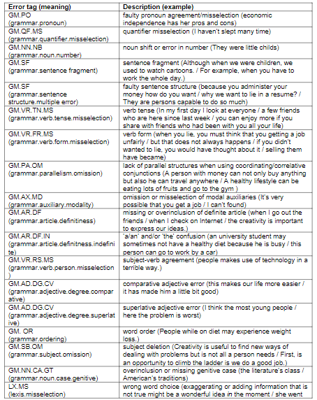 Thus, few of the investigations on the overall written production of Spanish L1 EFL university writers are Díaz-Negrillo and Valera (2010), Neff et al. (2004), and Díez-Bedmar (2005), out of which just two explore learners’ errors. To illustrate, Neff et al. investigated fourth-year university learners’ lexico-grammatical patterns of writer stance (e.g., it is + (adverb) adjective + that; it is + (adverb) said/thought + that) and compared them with those of professional writers and English L1 university students. The participants were EFL writers whose first languages were Dutch, Belgian-French, Italian, and peninsular Spanish and the language samples were extracted from ICLE. Main results showed an overuse of it is + (adverb) adjective + that and the agentless passive by the EFL learners, whereas the it is + adjective pattern showed no significant differences. Different from Neff et al., Díez-Bedmar (2005) analyzed first-year students’ essays to identify L2 learners’ written errors at a morphological, syntactic, semantic, and pragmatic level. Overall, the findings revealed that some of the most problematic areas were punctuation, spelling conventions, verb tenses, and articles. Then, as an error frequency study, Díaz-Negrillo and Valera (2010) examined a sample of the Non-native Corpus of English (NOCE, Díaz-Negrillo, 2009) and found a complex picture where comma usage, for example, seemed highly problematic along with lexical issues such as wrong word choice.