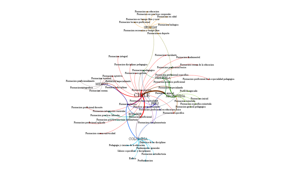 Cuando se analiza las áreas de formación más compartidas entre países, tenemos: formación básica en Chile (4), Colombia (3), México (3), Argentina (1) y Perú (1); formación general en Chile (8), Argentina (4) y Perú (2); formación específica en Argentina (2), Chile (1) y Colombia (1); formación complementaria en Chile (1), Colombia (1) y Perú (1); y formación pedagógica en Chile (1), Perú (1), Uruguay (1). Estos aspectos destacados se pueden ver en la Figura 1, a través de las conexiones entre países, así como el grosor de las aristas de estas áreas.