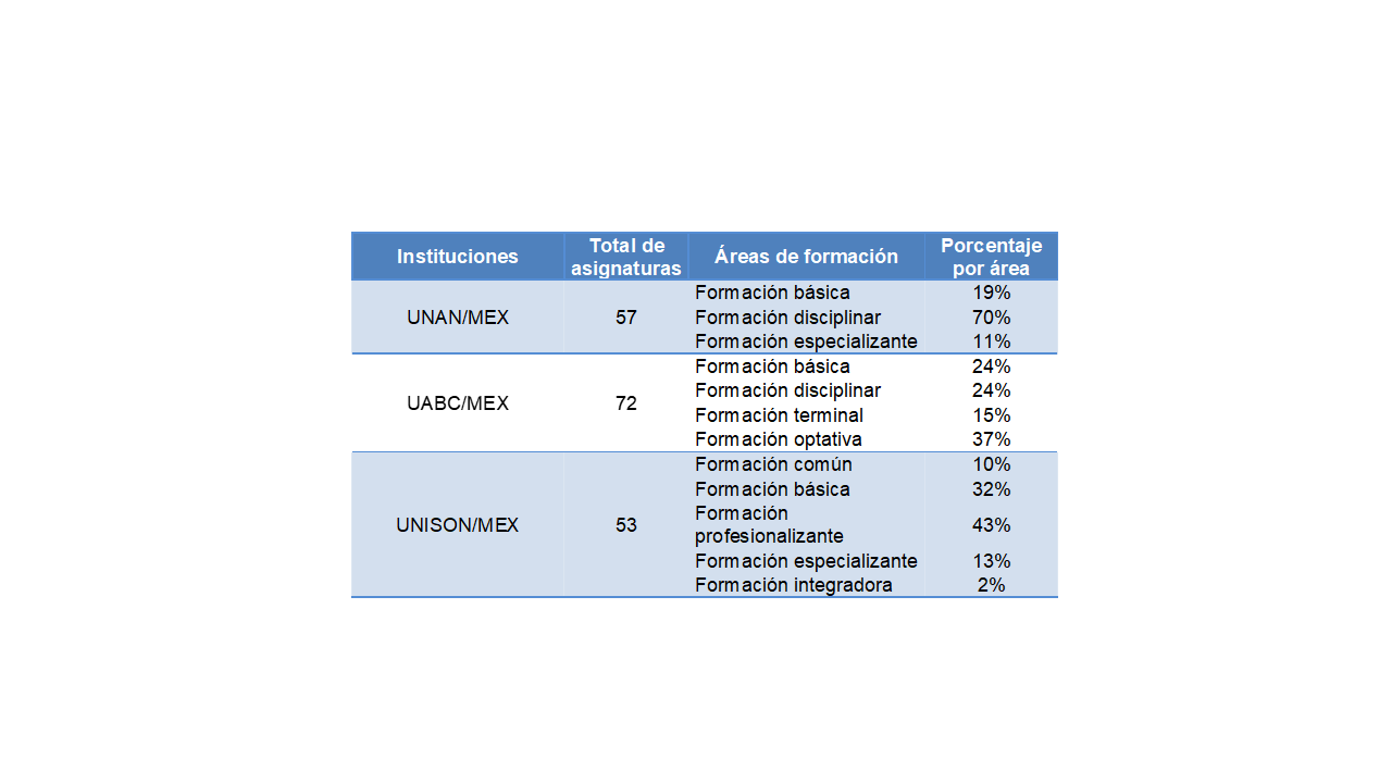 Tres áreas son específicas de las instituciones que las ofrecen, una denominada común (UNISON/MEX) y la otra especializante, presente en dos programas (UNAN/MEX y UNISON/MEX) y con diferentes entendimientos. El primero presenta un concepto de área orientada a una formación amplia, caracterizada por ofertas como: características de la sociedad actual, estrategias para aprender a aprender, ética y desarrollo profesional, etc. Esta misma racionalidad también fue identificada en nueve instituciones chilenas