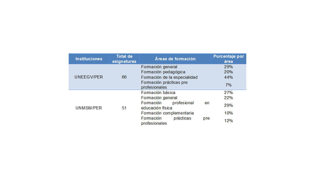En el resto de las áreas, la formación se concibe de forma diferente. La formación de la especialidad (UNEEGV/PER) presenta 29 asignaturas que abordan teorías y metodologías deportivas, aspectos biológicos, así como didáctica, currículum y evaluación en educación y en EF, mientras, que en UNMSM/PER, estos mismos temas se ofrecen en las áreas de formación básica (14) y profesional en educación física (15).