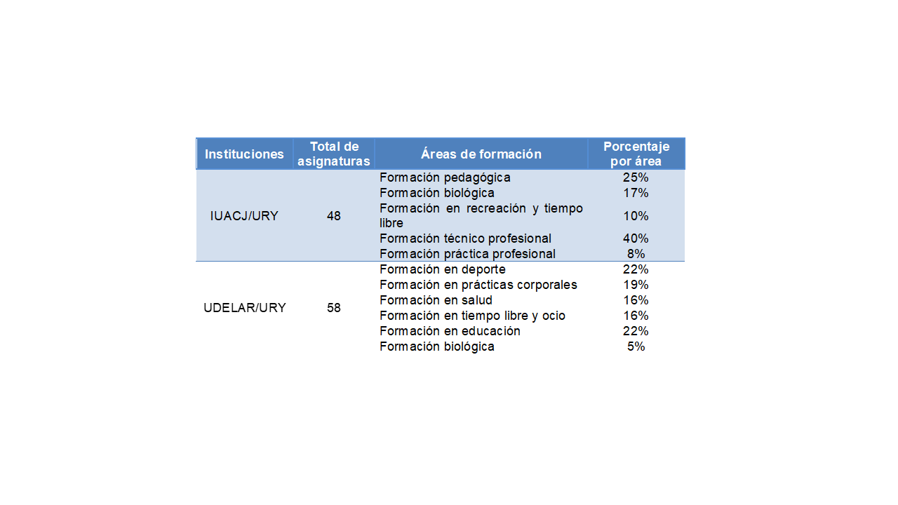 En general, aunque las nomenclaturas de las áreas no son similares, se ha identificado en los programas de Uruguay una alineación en la forma en que organizan la formación, en la que las áreas que componen los programas son específicas de la EF (deporte, prácticas corporales, biología, salud, tiempo libre, ocio, recreación), estableciendo conexiones con la educación. A diferencia de lo observado en los programas educativos previamente analizados, que dividen las áreas en una lógica basada en ofrecer una formación amplia de docentes en general primero y de docentes de EF, luego, esta última formación en algunos casos parece quedar fuera. Este alineamiento entre las instituciones de Uruguay se puede entender a través del artículo 142 de la Ley 17.556 (2002), que determina que la competencia de la formación de recursos humanos docentes en EF en el país es responsabilidad de la UDELAR/URY, quedando la IUACJ/URY bajo su responsabilidad.