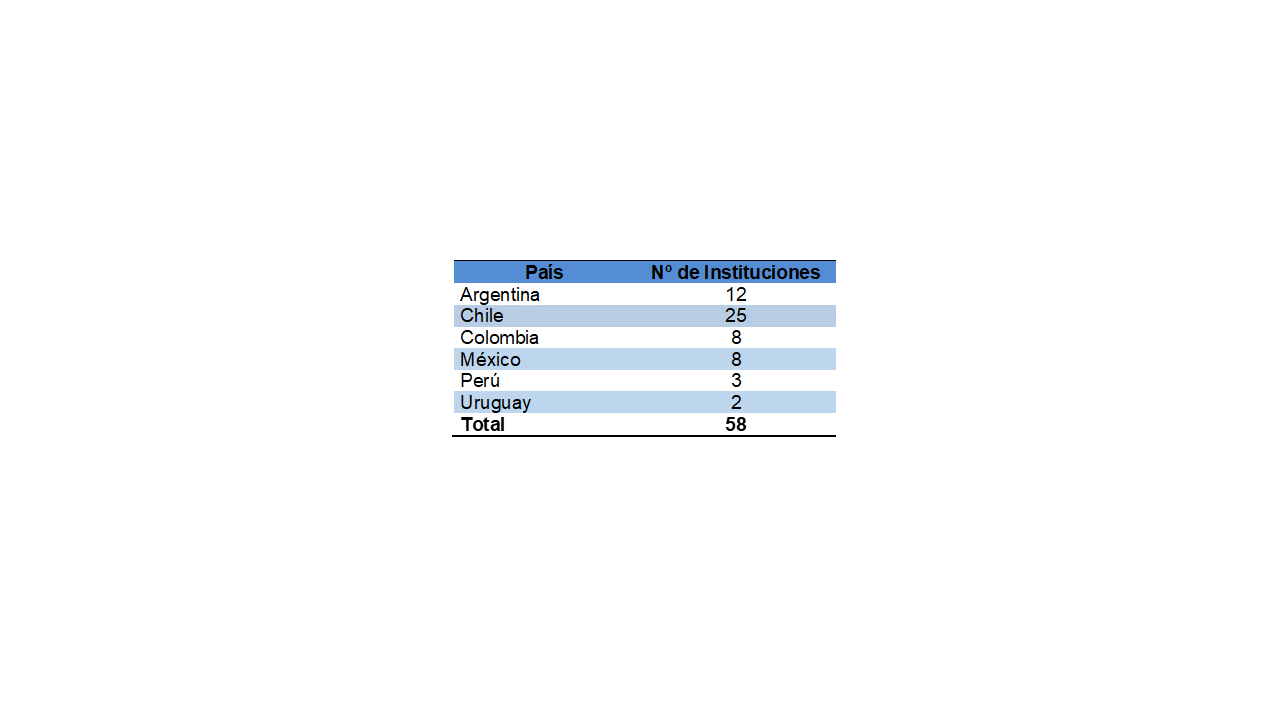 Los datos se obtuvieron a partir de los programas de estudios disponibles en los sitios web de las instituciones, visitados entre agosto y noviembre de 2020. Inicialmente se encontraron 58 instituciones de seis países que cumplieron con los criterios a, b y c. En la Tabla 1, se presentan los países y el número de instituciones encontradas.