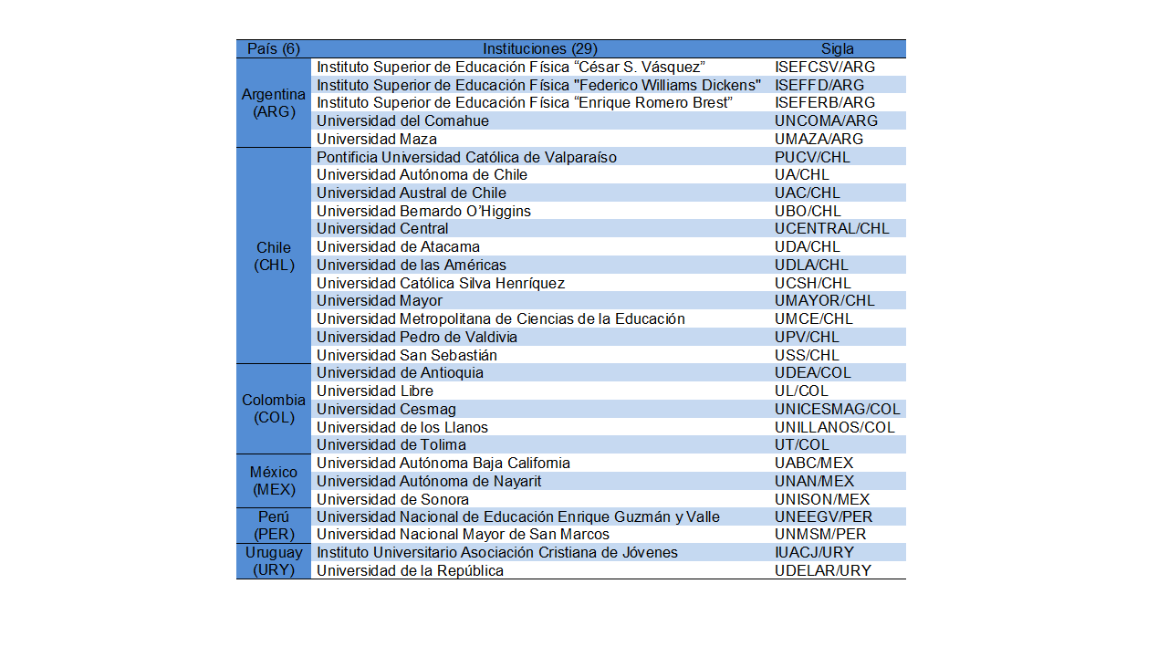Para delimitar las instituciones participantes, inicialmente se tomó en cuenta la base de datos compartida por el Proyecto Paraguas Prácticas evaluativas en la formación inicial de profesores: análisis de las instituciones latinoamericanas[3] , compuesto por ocho países latinoamericanos. En este estudio, los criterios para la creación de la base de datos fueron: a) ser una institución ubicada en la LA hispanohablante; b) contar con la oferta de un programa de formación de profesorado de EF; y c) tener en su currículo una asignatura [4] específica sobre evaluación.