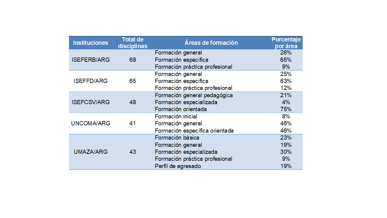 El primer país y los respectivos programas analizados son los de Argentina, en los cuales la formación docente es realizada por dos subsistemas: 1) integrado por institutos de educación superior para docentes e institutos de formación técnica profesional, subordinados a los ministerios o secretarías provinciales de educación (jurisdicciones) y el gobierno de la ciudad de Buenos Aires, con el apoyo del Ministerio de Educación a través del Instituto Nacional de Formación Docente; 2) subsistema relacionado con instituciones universitarias (universidades e institutos universitarios), dependiente del Ministerio de Educación. En esta investigación se consideraron tres institutos superiores (educación pública en gestión estatal) y dos universidades, una pública (UNCOMA) y otra privada (UMAZA). Para resaltar las áreas de formación ofertadas, se elaboró la Tabla 3, que contiene las siglas de las instituciones, el número total de asignaturas por programa, las áreas de formación y el porcentaje de asignaturas ofertadas por área.