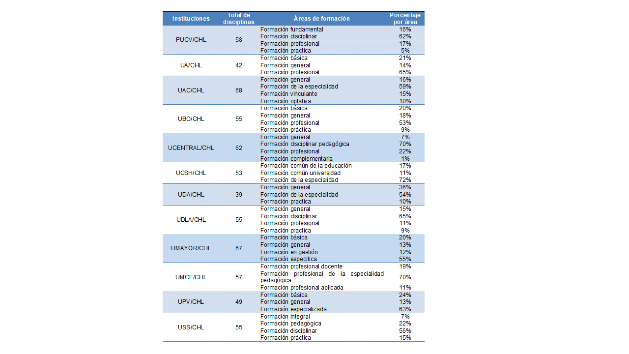 Chile es el país con mayor número de instituciones y áreas de formación en este estudio. La formación de profesores, como la de Argentina, se ofrece en universidades e institutos profesionales. Las universidades se dividen entre tradicionales y privadas, algunas de las cuales reciben ayudas estatales y autofinanciamiento (agrupadas en el Consejo de Rectores de las Universidades Chilenas), y otras no están incluidas en este sistema. En los institutos, la formación docente solo puede ofrecerse en aquellos donde incluso la promulgación de la Ley Orgánica Constitucional de Enseñanza (1990) ya la ofrecía, ya que se empezó a exigir un diploma otorgado por una universidad, siendo considerado título universitario. En esta lógica, nuestro estudio comprende 12 universidades: dos públicas (UDA/CHL, UMCE/CHL), dos privadas que forman parte del Consejo de Rectores (PUCV/CHL, UAC/CHL), y ocho pertenecen a la red privada. Para resaltar las áreas de formación ofrecidas, se elaboró la Tabla 4.